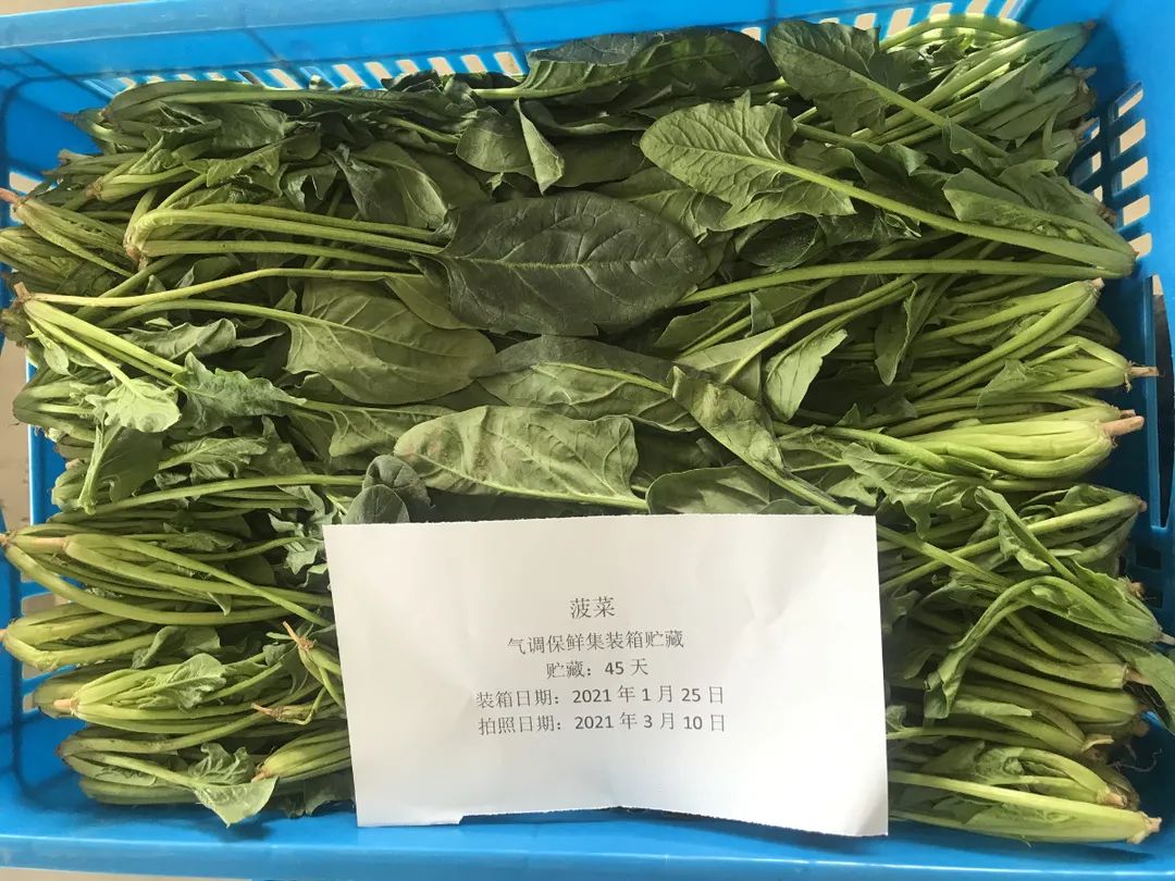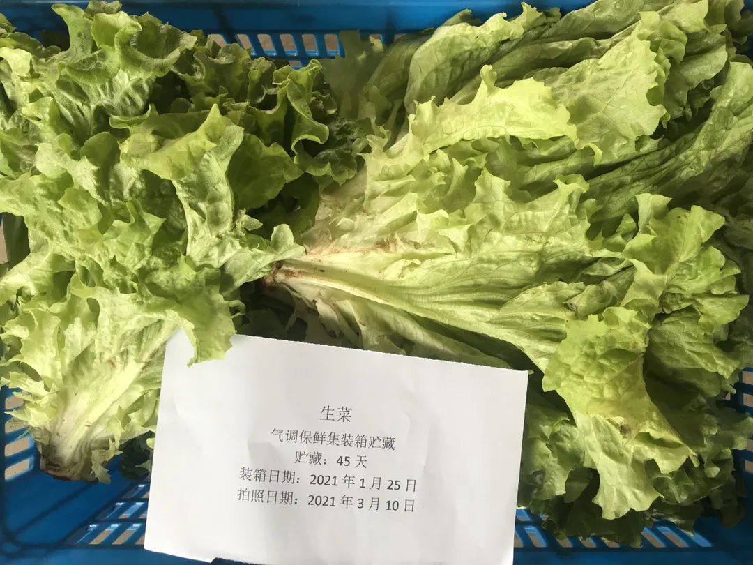 在廠內(nèi)進(jìn)行技術(shù)研發(fā)固然重要,在實(shí)踐中跟蹤驗(yàn)證才能將裝備性能落實(shí)好。在廠內(nèi)完成保鮮試驗(yàn)后,氣調(diào)冷藏集裝箱又馬不停蹄趕往山東壽光開(kāi)展蔬菜基地陸用保鮮試驗(yàn),在北方寒冬季節(jié)里,測(cè)試設(shè)備的應(yīng)用工況,并作為氣調(diào)冷藏集裝箱走向大棚蔬菜保鮮的一次前期基礎(chǔ)性工作,全程跟蹤設(shè)備運(yùn)行及試驗(yàn)情況。2021年1月25日~3月11日,在貯藏45天后,除西蘭花、花椰菜、小白菜外,生菜、菠菜、油麥菜、上海青4種菜品,幾乎仍保持著剛?cè)霂?kù)時(shí)的新鮮狀態(tài),失重率及折損率均不大于10%及15%。能達(dá)到此保鮮效果,也與基地果蔬好的品種與品質(zhì)有關(guān)。